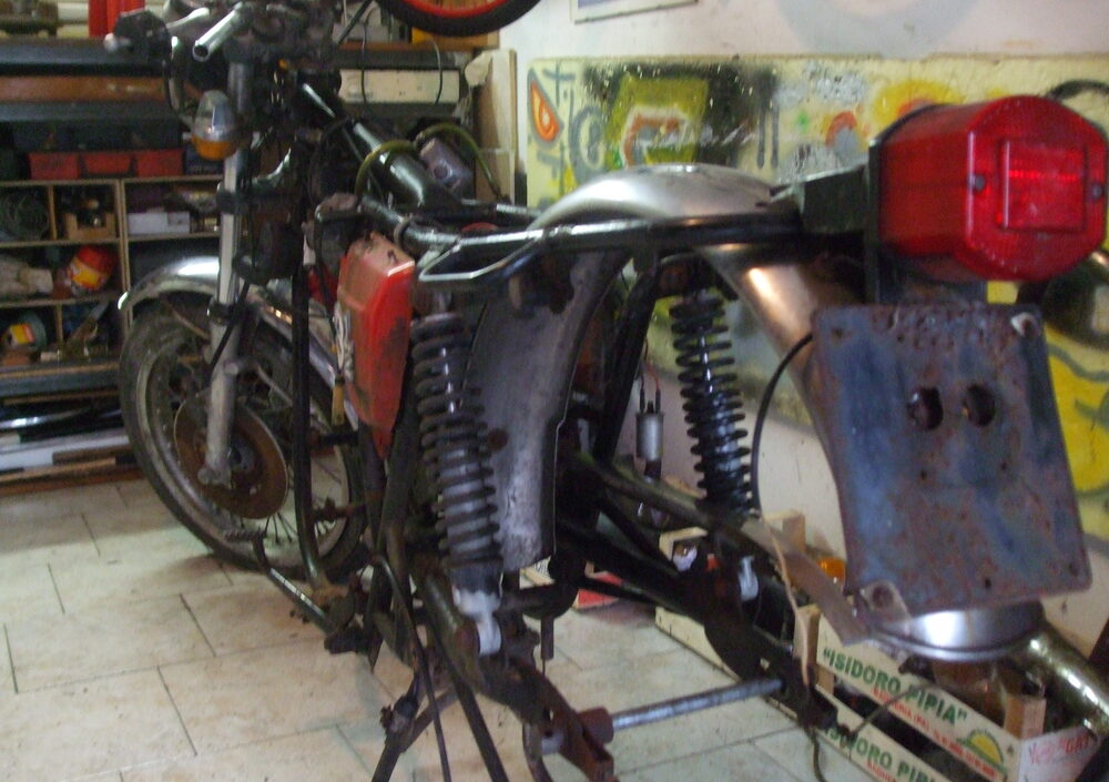 È per la parte di riverniciatura del telaio e di tutti gli altri dettagli neri che il garage, da tale, si è trasformato in una carrozzeria domestica. Successivamente si è passati alla ricerca su internet dei fianchetti, ed al restauro e verniciatura del serbatoio. Visto lo stato precario di quelli d’origine, sono stati acquistati i cerchi, i raggi, e i nipples con montaggio completo in proprio delle ruote.