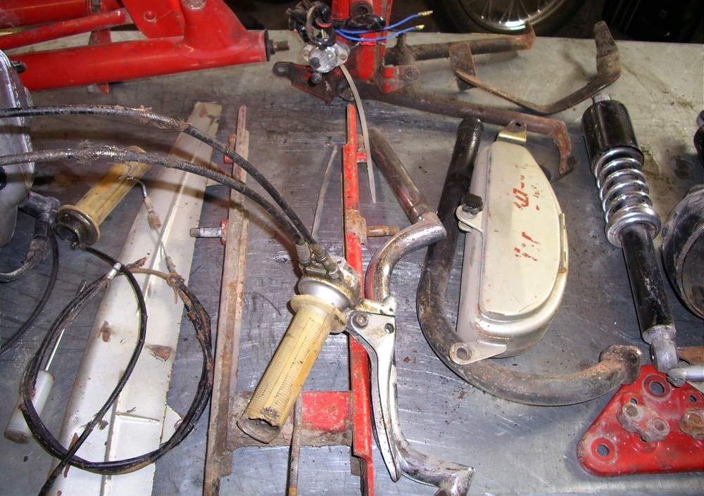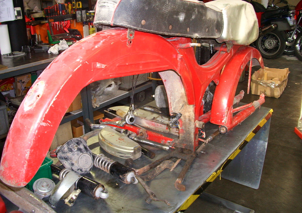 Successivamente il telaio è stato sabbiato, gli attacchi degli ammortizzatori posteriori, logori dagli anni di uso, raddrizzati e, infine, il tutto è stato riverniciato nella tipica colorazione rosso lucido, parafango anteriore e foderi forcella compresi. Altri particolari, quali pedane, cavalletto centrale, telaio della sella e raggi delle ruote, sono stati riverniciati in nero, mentre i cerchi sono stati cromati assieme allo scarico e al collettore che, fortunatamente, erano sani.