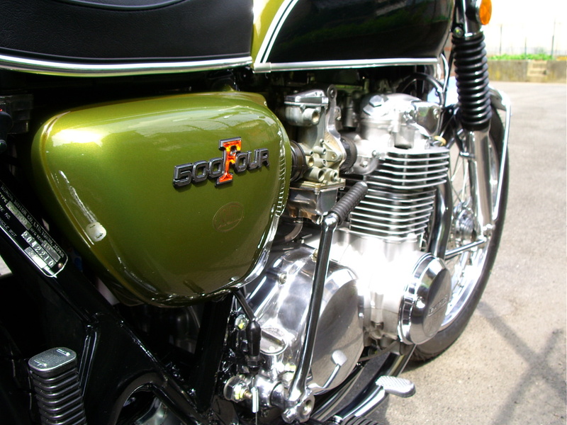 Una volta completato il lavoro di carrozzeria, si è passati al rimontaggio della moto, senza tralasciare la revisione dei tipici strumenti piccoli a fondo verde scuro e fondoscala del contagiri rosso, la sostituzione della sella con quella originale nera piatta a due posti con fodera saldata a frequenze e sono state montate le marmitte originali 4 in 4.