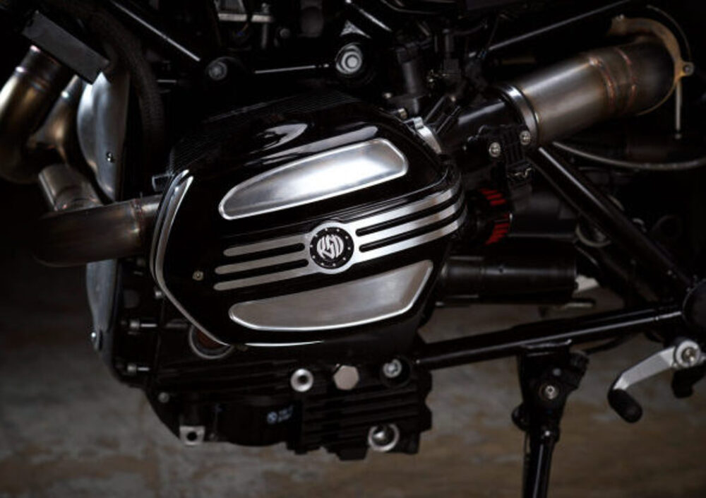 Il resto delle modifiche è più convenzionale nei materiali ma non per questo meno sofisticato; lo scarico – il cui silenziatore ricorda un Supertrapp ma pare invece essere creazione originale del preparatore stesso – è stato completamente spostato, con un complesso giro che lo fa passare sopra il motore (e sotto il serbatoio, con le relative necessità in termini di isolamento termico) liberando così un po’ di luce a terra e mettendo in mostra la zona inferiore della coppa dell’olio. Lasciare la protezione plastica sarebbe stata un peccato – ecco quindi una ben più pregiata unità in alluminio battuta a mano in sostituzione. Completamente rifatto anche il lato aspirazione, con una scatola in acciaio inossidabile e filtro in cotone.