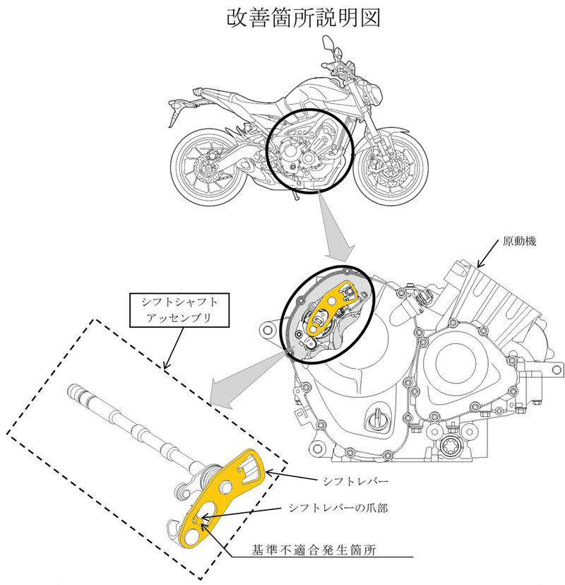 Oggetto del richiamo è la piastrina posta sulla sommità del desmodromico del cambio, il cui bordo interno tagliente e non correttamente smussato potrebbe innescare una possibile frattura a fatica. In tal caso l'innesto delle marce non funzionerebbe correttamente. Il disegno che vedete, e che mostra con due frecce il bordo interessato sulla piastra colorata di giallo, è stato diffuso dal Ministero Giapponese del Territorio e delle Infrastrutture.