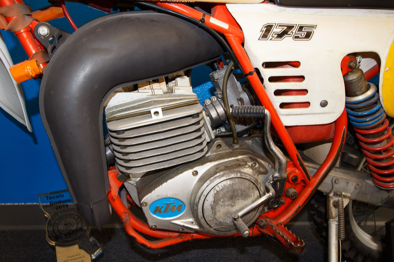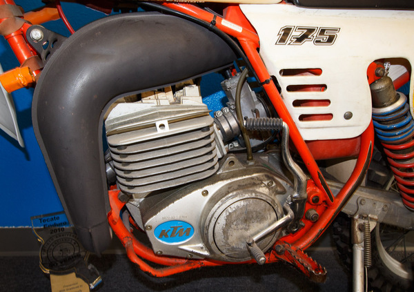 «E’ la moto ufficiale di quando correvo, un pezzo più unico che raro. Ha un cambio ad 8 marce e la sede del gruppo lamellare completamente realizzata ad hoc. Erano gli anni in cui in Europa Kreidler, Zündapp e gli altri stavano sperimentando cambi da 8 o anche 10 marce nelle cilindrate più piccole, e KTM decise di provare sulla mia moto. Sono sicuro che qualcuno nell’Europeo corse con lo stesso prototipo, ma qui ce l’avevo solo io. Il motore era ancora il Sachs e gli ingranaggi delle marce vennero ridotti di spessore in modo da fare spazio per due marce in più. La necessità di avere più marce derivava dal fatto che in trasferimento la moto non passava le 55 mph e quindi arrivavi a inizio speciale sempre al pelo. In pratica le due marce in più permettevano di andare più veloce e avere il tempo di cambiare la gomma e lavorare sulla moto prima di entrare in linea. Il basamento è quello del 250, ma KTM riteneva che la coppia del 250 avrebbe tritato il cambio, per cui decisero di metterci l’albero motore del 125 (molto più leggero) e la termica del 175. Tutta la parte che ospita il gruppo lamellare è completamente modificata per poter montare un pacco Yamaha YZ, e il carburatore è un Bing. Ricordo che provai il Mikuni e sembrava molto meglio, ma all’epoca non riuscivo a trovare i getti giusti, quindi optai per il Bing. Il cambio era comunque abbastanza fragile, quindi per la maggior parte della stagione usai il 6 marce di serie».