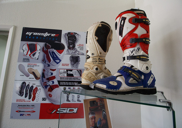 Dopo questa breve chiacchierata, Bill mi ha fatto vedere gli uffici di Motonation, che si occupano solo delle vendite, del servizio clienti e del race service. Tutto il magazzino della merce si trova in un centro logistico a Los Angeles. Il prodotto principale è ovviamente SIDI, un marchio con il quale lavorano ormai da una vita. Di recente hanno anche iniziato a distribuire la calzatura da ciclismo, che, essendo un mercato completamente diverso, viene gestita da una sussidiaria chiamata “Ciclista America”. L’intero edificio si presta ad una sorta di caccia al tesoro per appassionati: stivali firmati dai campioni di oggi e di ieri, pezzi del passato da pilota di Bill, la DKW che un tempo apparteneva a suo padre, foto di vari campioni e appassionati del marchio, tra i quali spicca l’attore Matt LeBlanc (ve lo ricordate in Friends?). Anche qui c’è, ovviamente un piccolo aneddoto: