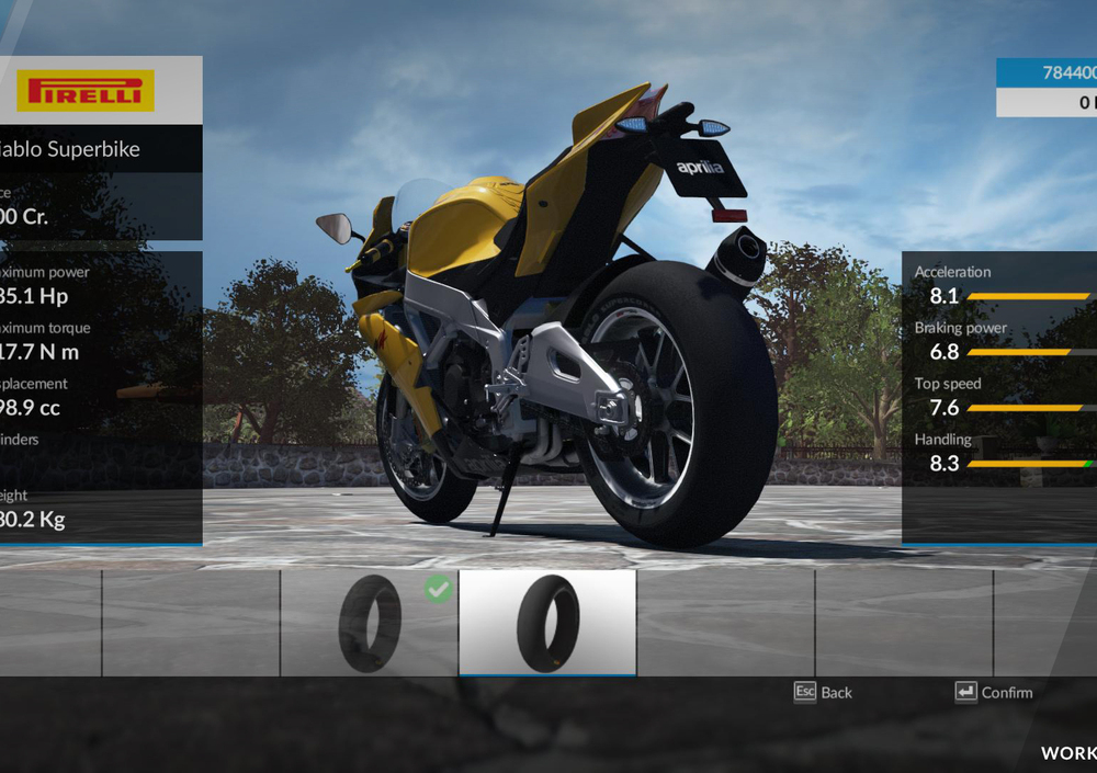 La potenza però è nulla senza controllo, recitava un celebre slogan qualche anno fa, ed è quindi possibile sostituire anche diverse parti della ciclistica e della trasmissione. Sospensioni, pastiglie, pinze freno, raccorderia, quindi, ma anche catena, scatola cambio, quickshifter e modelli di pneumatico – Milestone ha ottenuto un accordo in esclusiva con il gruppo Pirelli per proporre l’intera gamma sportiva Pirelli/Metzeler.