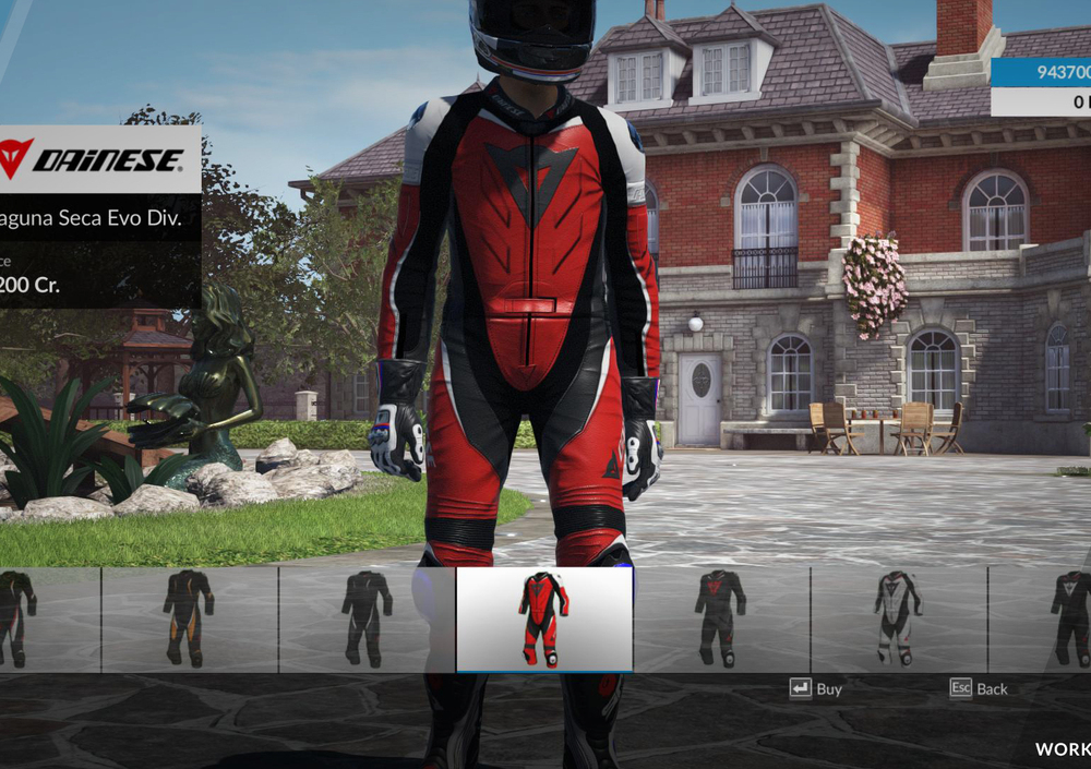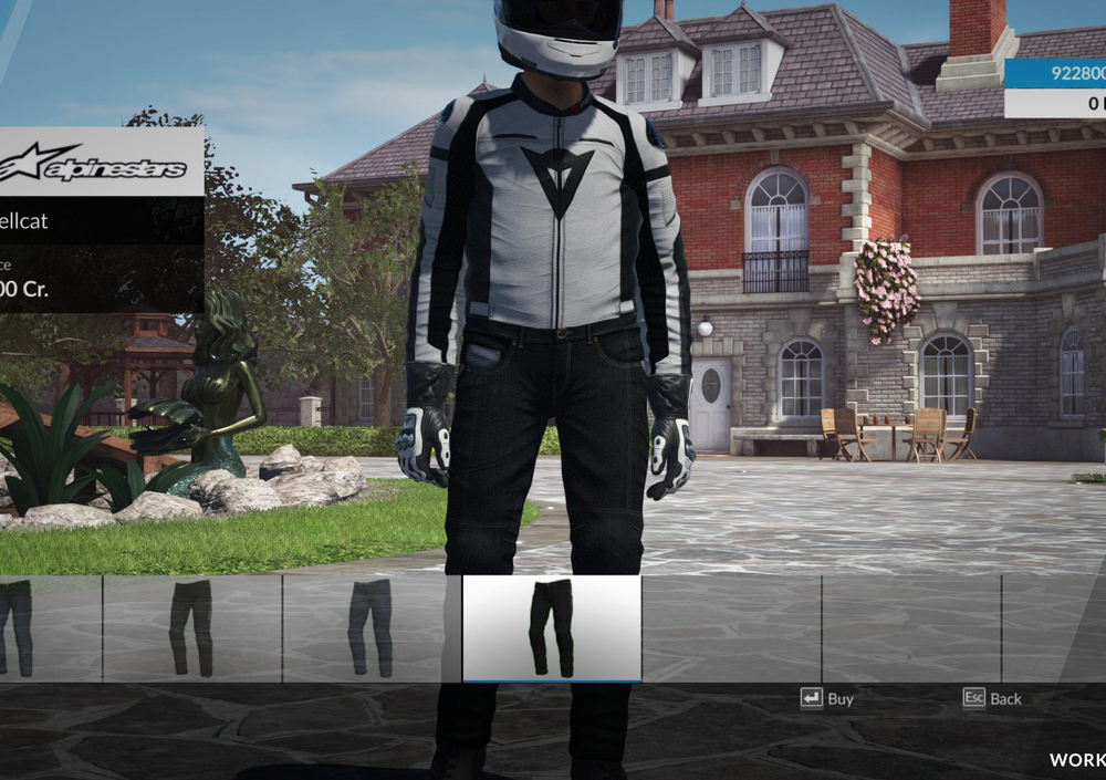 Poi tocca al vestiario. All’inizio, il gioco vi “regala” un completo da pista (tuta professionale, casco, guanti e stivaletti) ed uno stradale (casco, giubbotto, pantalone tecnico, guanti e stivali) da scegliere fra quelli offerti.