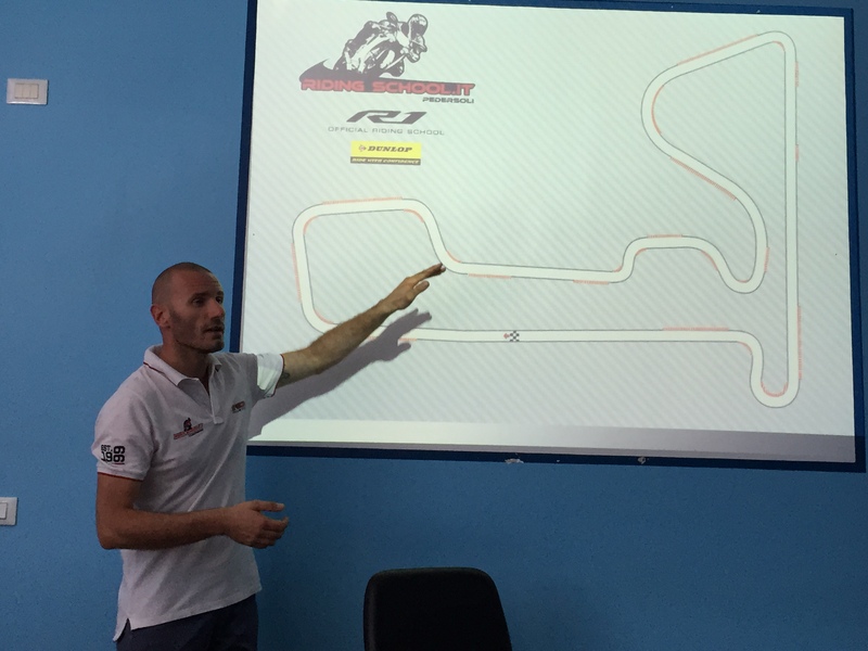 Ci sediamo al tavolo con il nostro istruttore Diego Giugovaz, campione Italiano Supersport, che subito inizia a metterci a nostro agio e dopo le prime presentazioni per capire anche il nostro livello di capacità, ci spiega la suddivisione dei turni, che sono quattro per l'intera giornata della durata di 15/20 minuti più uno di prove libere.