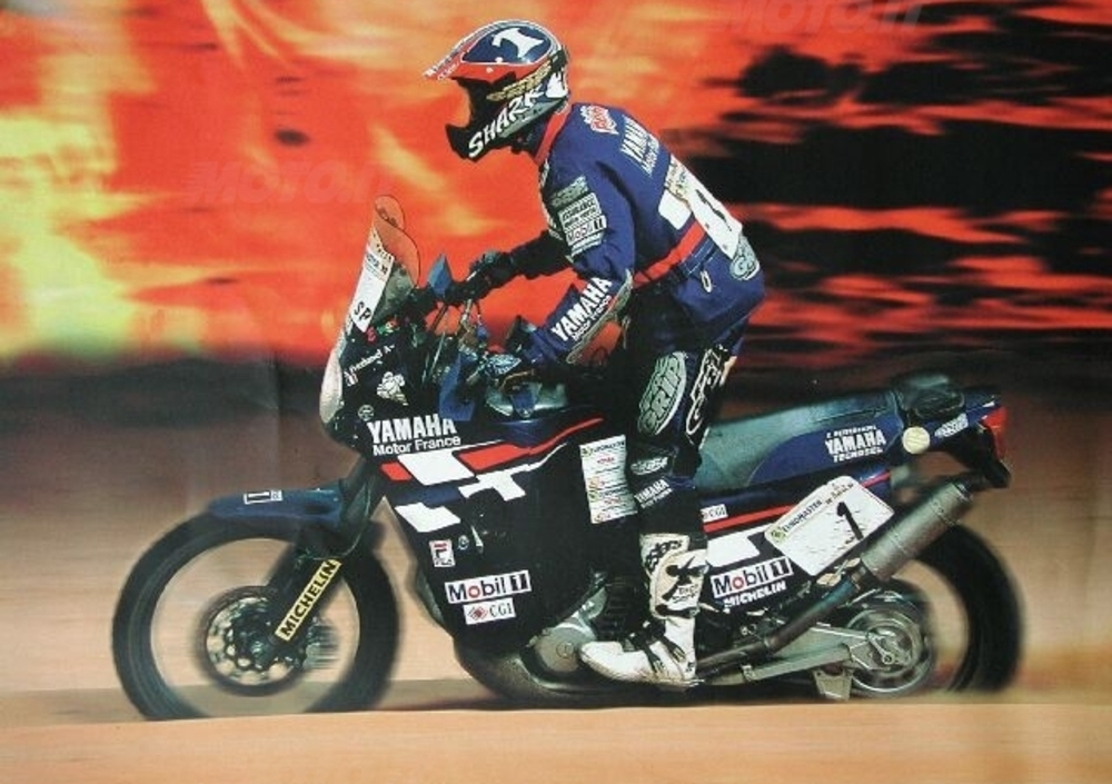 E la Yamaha? Nel 1988, la Casa di Iwata presentò la sua versione di maxi-enduro bicilindrica, che, “iperbolizzando” il nome della ormai celeberrima sorella monocilindrica nata nell’85, venne battezzata Superténéré. Una moto fortemente voluta dal forte importatore francese Sonauto, nella persona di Jean Claude Olivier, tutt’oggi influentissimo presso la Casa di Iwata. Olivier, egli stesso bravo pilota da deserto (fu terzo alla Parigi-Dakar del 1985 con la Ténéré 600) e attuale presidente di Yamaha Moto France, è sempre stato un tipo dalle idee molto chiare e spinto da una fortissima passione motociclistica, tanto da costruirsi una versione da rally della famosa quadricilindrica sportiva FZ750 maggiorata a 950 cc, denominata YZT (pesava la bellezza di 300 kg!), che per un paio d’anni utilizzò in gara. Fu dunque Olivier a premere per l’arrivo della Superténéré 750 bicilindrica, che nel tempo si rivelò la moto più vincente e affidabile delle celebri maratone africane. L’epopea vincente della grossa Yamaha iniziò già nel 1991, con l’arrivo vittorioso sulla spiaggia rosa di Dakar del giovane Stephane Peterhansel. Il quale si ripetè implacabile fino al 1998, fallendo il colpaccio solo nel ’94 e nel ’96 quando vinse Edi Orioli, prima con la Cagiva e poi, anche lui, con la Yamaha.