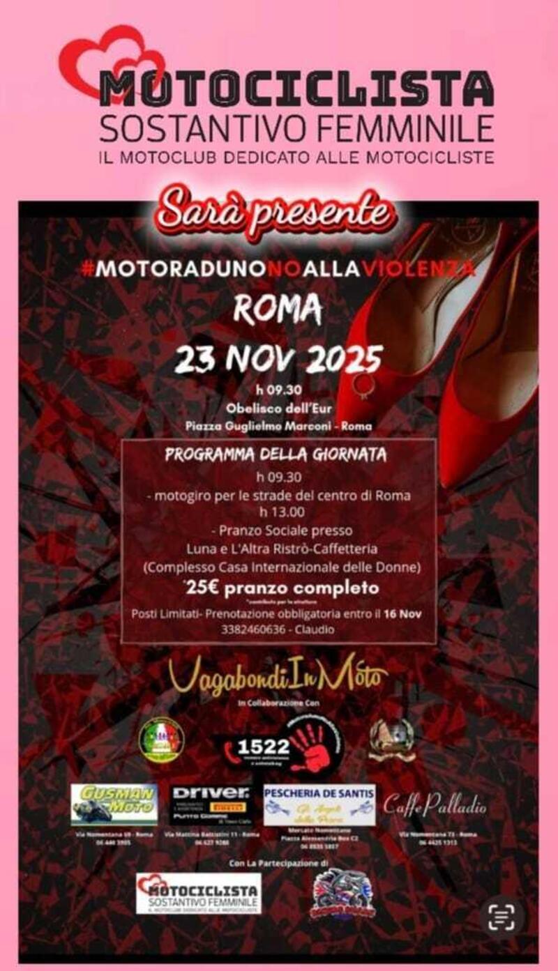 Appuntamento dunque per domenica 23 novembre, nella grande piazza dell'Obelisco all'Eur, per un motogiro lungo le strade del centro di Roma, con destinazione finale Piazza del Popolo; per chi volesse, è poi previsto un pranzo sociale presso la Casa Internazionale delle Donne, a via della Lungara, vicinissima a Trastevere; in questo caso, è obbligatoria la prenotazione al numero 338 2460636.
