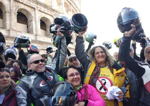 Motociclisti e ciclisti, categorie che di solito hanno più motivi di dissidio che occasioni di incontro, hanno sfilato insieme per le strade di Roma, lungo la Cristoforo Colombo ed arrivando in gruppo sotto il Colosseo: oltre 200 moto e tantissime bici, che hanno risposto all’invito di Graziella Viviano, la mamma di Elena Aubry, giovane motociclista morta a maggio del 2018 in un incidente sulla via Ostiense.