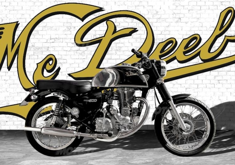 Allestita nell’atelier McDeeb (nick name dell’eclettico e super-appassionato specialista Fabrizio DiBella), sito a Bienno – lungo la strada che dal lago d’Iseo conduce verso l’Aprica o il Tonale – questa versione Clubman Superlight della Royal Enfield 500. Questa bella special si distingue dalla Clubman standard (a sua volta allestita da DiBella) per la carrozzeria cromata e nera con filetti oro, i parafanghi in alluminio, cerchi a bordo alto pure in alluminio, il manubrio rialzato anziché il caratteristico “condorino” della Clubman, il comando gas rapido Tommaselli e il classico silenziatore a bottiglia anziché tronco-conico.