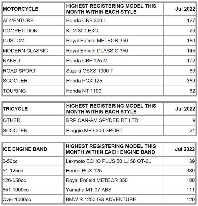 Per quanto riguarda i modelli più venduti nel mese di luglio, trovate nella tabella qui sotto i primi nelle rispettive tipologie e classi di cilindrata.