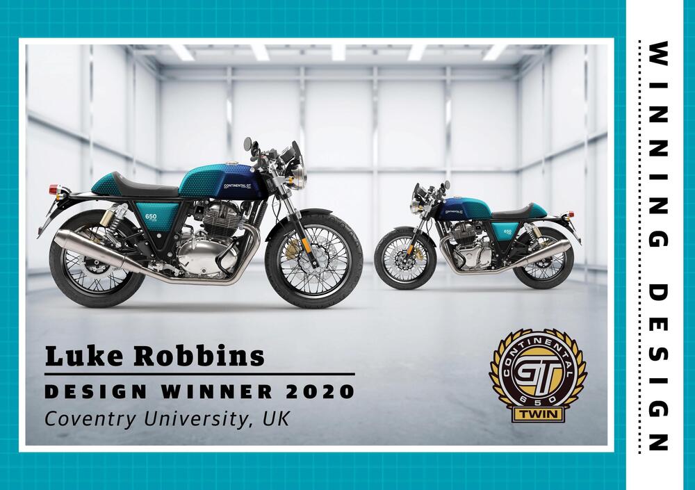 Luke Robbins, studente della Coventry Universitynel Regno Unito, ha invece vinto il premio per la Continental GT 650 con una personalizzazione grafica estremamente contemporanea, giocata su una trama geometrica triangolare e una degradazione cromatica sui toni del blu e del verde.