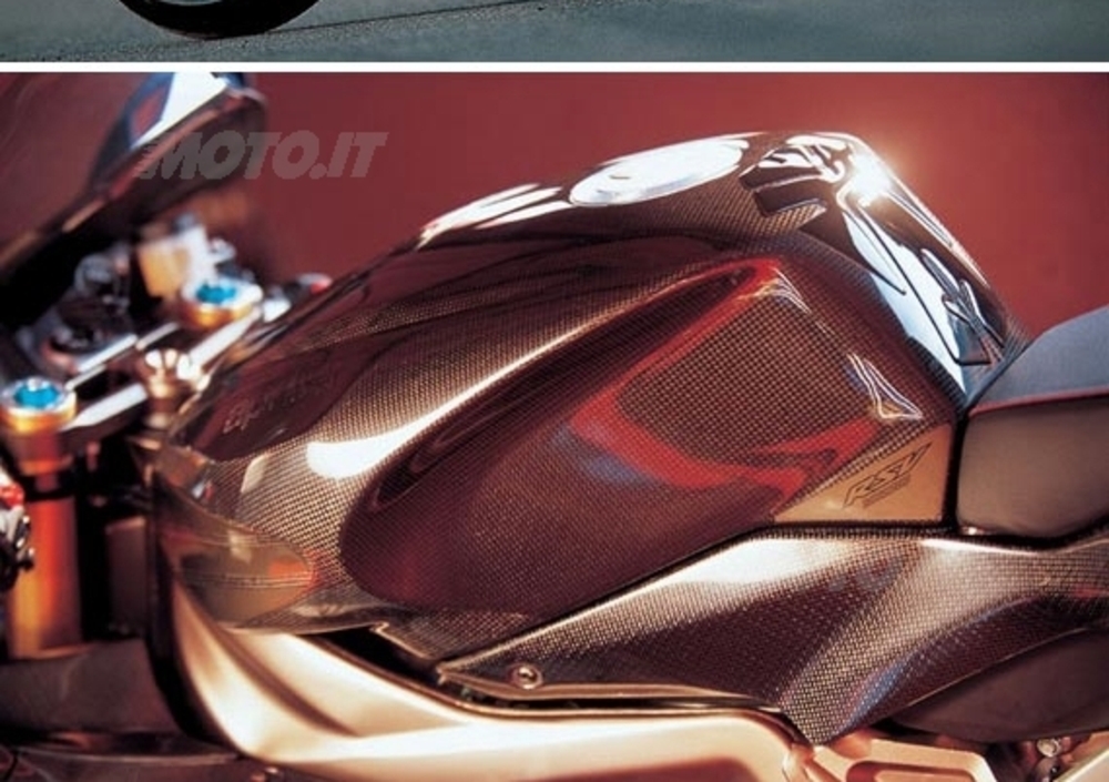 Lo stile inconfondibile di RSV 1000 R è ulteriormente esaltato dalla colorazione completamente nera, sottolineata dalla verniciatura di telaio e forcellone in Titanium Gold. Tutte le sovrastrutture sono realizzare in carbonio, compreso il serbatoio*. I componenti sono fissati con viteria in Ergal Aprilia Racing, per il massimo della leggerezza. Il peso scende a 175 kg, un record per la categoria.