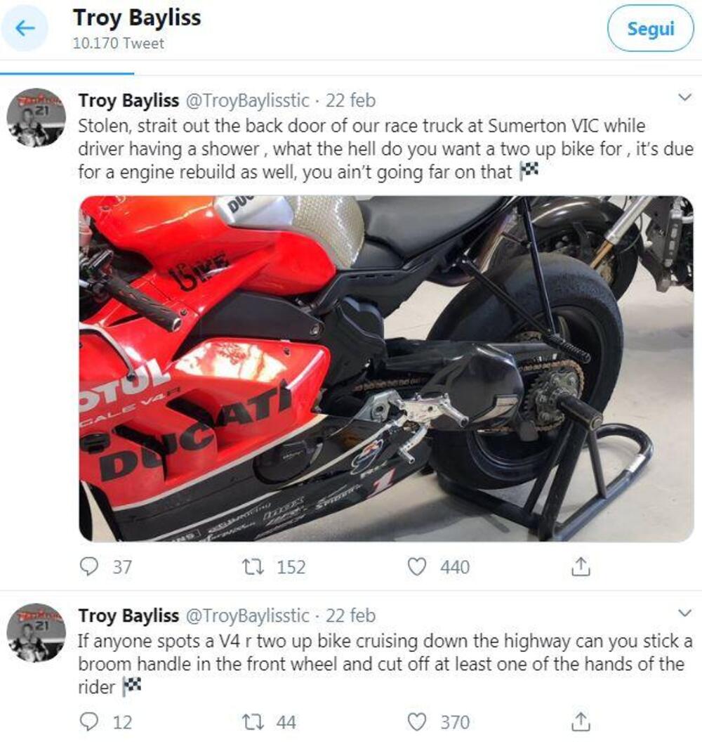 E' così che Troy Bayliss – iridato SBK nel 2001, 2006 e 2008, 52 vittorie e 94 podi in 154 gara - ha scritto su Twitter parole di fuoco contro l'autore del furto della sua Ducati Panigale V4R.