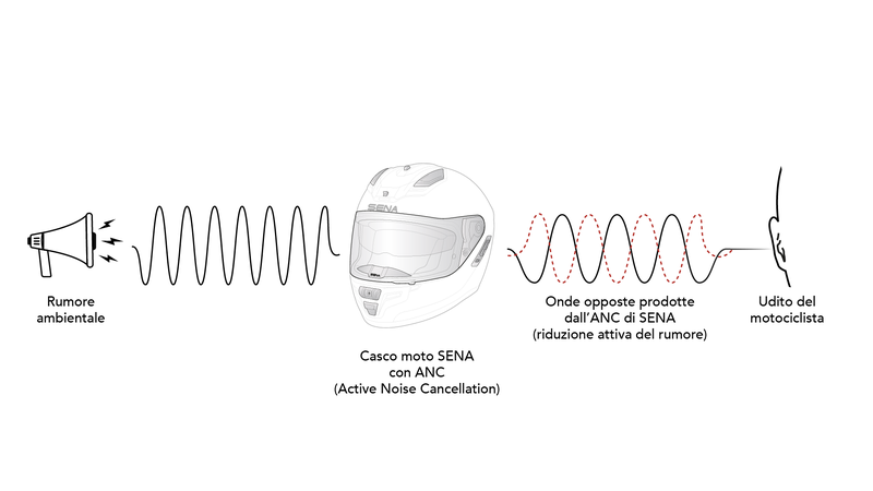 Il rumore del vento, soprattutto alle velocità autostradali, è una realtà difficile da ignorare. Superando i 90 km/h, infatti, il livello sonoro all’interno del casco può facilmente superare i 90 decibel, un volume che affatica rapidamente le orecchie e la concentrazione. Proprio per questo, SENA ha sviluppato una tecnologia di riduzione attiva del rumore (Active Noise Cancellation, ANC) dedicata ai motociclisti, per una guida più confortevole senza perdere il contatto con ciò che succede intorno.