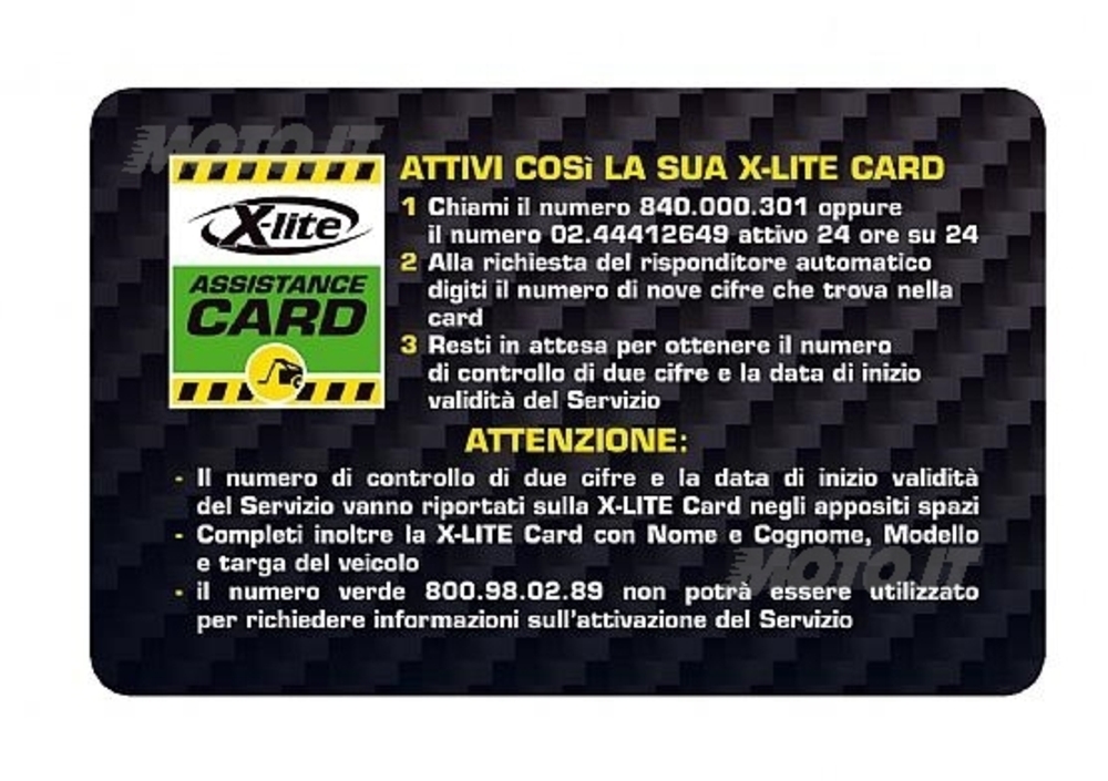 Fino al 31 marzo 2008, presso i punti vendita aderenti all’iniziativa, tutti coloro che acquisteranno un casco X-lite riceveranno subito in omaggio X-LITE ASSISTANCE CARD.