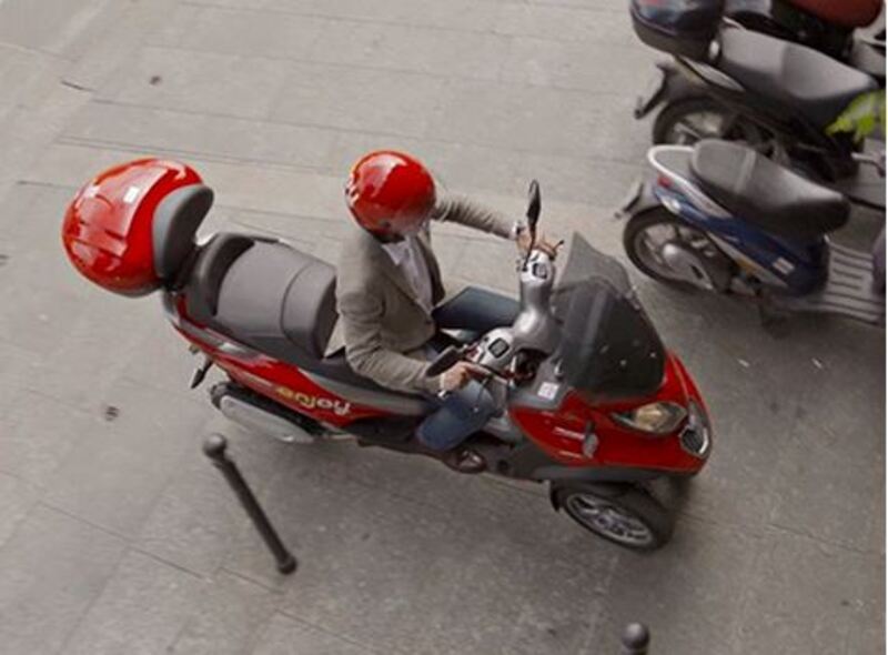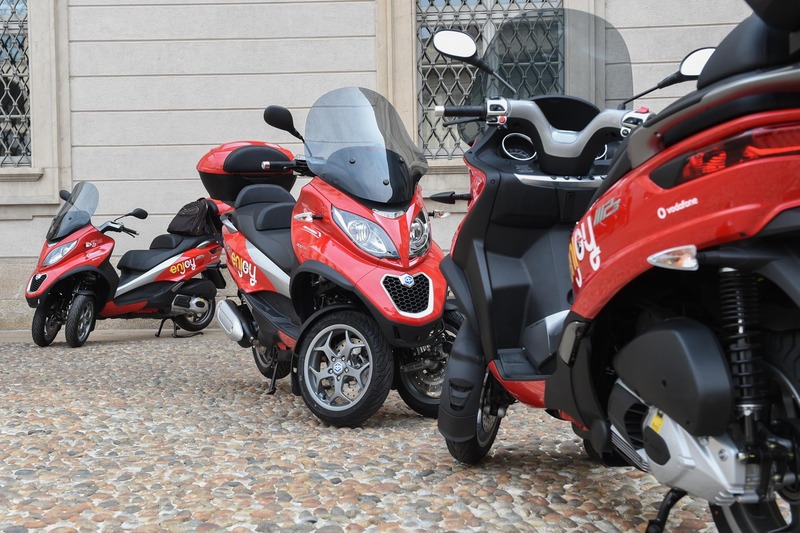 Inaugurato ufficialmente a Milano lo scorso 15 luglio, lo scooter sharing Enjoy è in assoluto il primo servizio di scooter in condivisione in Europa. Una partenza giunta in leggero ritardo rispetto all'annunciato via in concomitanza con l'apertura di Expo 2015, e soprattutto iniziata con una flotta di appena una decina di scooter Piaggio MP3 sui 150 veicoli promessi a regime. Si tratta dei tre ruote Piaggio resi speciali non soltanto per avere la stessa colorazione rossa delle auto condivise di Enjoy.