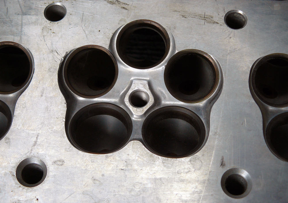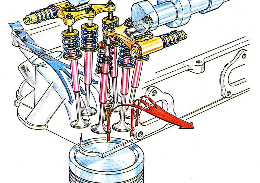 Una soluzione che da tempo si è affermata sui motori di elevate prestazioni, diventano addirittura “obbligatoria” al di sopra di una certa potenza specifica, è quella che prevede l’impiego di due valvole di aspirazione e di due valvole di scarico per ogni cilindro, con i relativi condotti ricavati nei lati opposti della testa. Da una parte c’è quello di aspirazione, che a un certo punto si divide in due “rami”, ognuno dei quali raggiunge la propria valvola. Dalla parte opposta ci sono due condotti di scarico, ciascuno dei quali proviene da una valvola, che di norma si uniscono poi a formarne un solo, di maggiore sezione, che esce dalla testa per collegarsi al tubo che porta i gas combusti verso l’uscita nell’atmosfera.