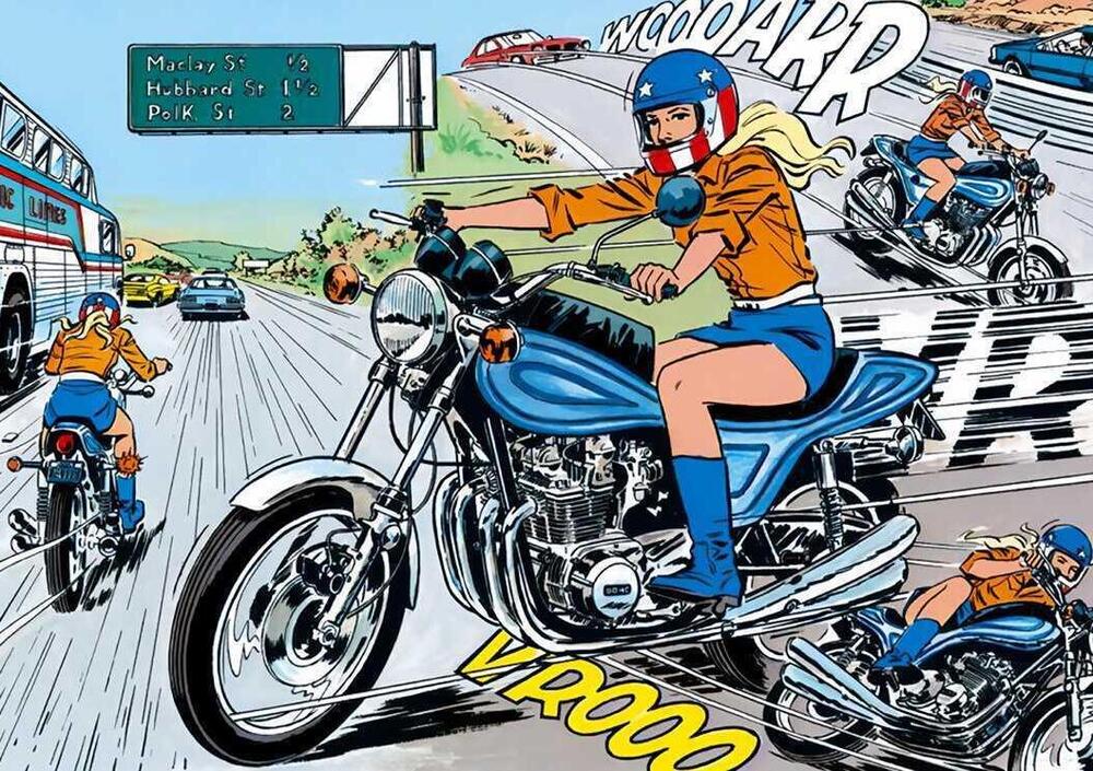 Julie Wood in Francia ma non solo è ancora oggi un personaggio molto amato, come si dice in questi tempi "iconico". La sua ultima avventura si chiama "Mortel Rodéo" e stavolta Julie Wood riprende vita tra le pagine di un nuovo album contraddistinto anche da una tecnica più contemporanea opera di Philippe Pelaez e Claudio Stassi che hanno raccolto l'eredità artistica di Graton. Ma soprattutto per noi feticisti delle due ruote a motore, questa volta la bella Julie si trova a guidare una moto che riconosciamo al volo: si tratta di una BMW R 12, un modello uscito da un anno come sappiamo e in questo caso lo vediamo con una particolare colorazione personalizzata molto stelle-e-striscie. La scelta della moto ovviamente non è casuale ma è il risultato di una collaborazione degli autori con BMW Francia.