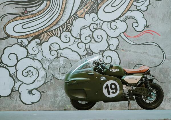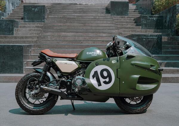 La carenatura integrale è stata realizzata in vetroresina, con anche le “portiere” laterali come sul modellino fumettoso. La sella sportiva è stata fatta in pelle chiara, il logo Capsule Corp. riprende quello manga e il colore verde è più una tinta militare che non il verde Moto Guzzi. Ma tant'è...