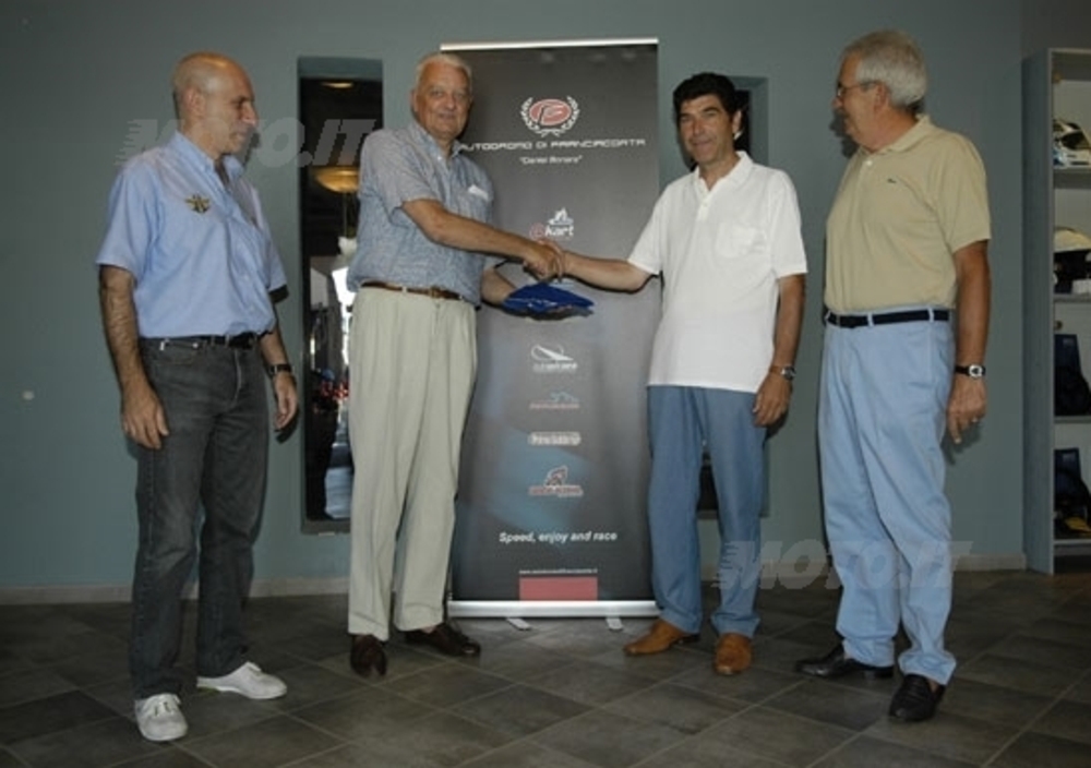 Nell’immagine: il Presidente FMI Paolo Sesti consegna a Ettore Bonara, presidente dell’Autodromo di Franciacorta, la bandiera ufficiale della FMI. All’estrema sinistra il vicepresidente Fabio Larceri, all’estrema destra il sindaco di Castrezzato, Pierluigi Treccani.