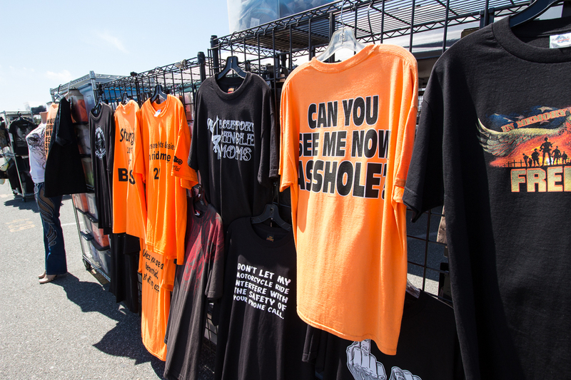 C’erano poi bancarelle piene di tutto, dai vestiti vecchi - scusate, vintage - ai caschi usati (luridi anche loro) ai vecchi stemmi ed emblemi. Immancabile la pila di patacche da cucire sul giubbotto, un espositore ne aveva una montagna buttata per terra, e i due o tre loschi figuri che mentre provano a venderti i pezzi di una R1 stesi alla buona su un lenzuolo, continuano a guardarsi intorno come se avessero paura di qualcosa. Per la cronaca: non mi hanno lasciato fare foto.