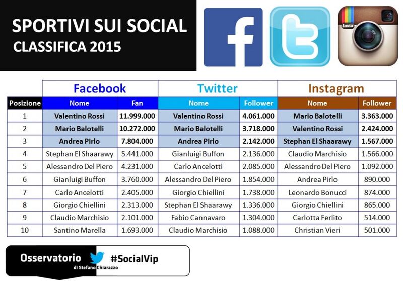 Come accade da tempo, su facebook Valentino Rossi è al primo posto e ha superato i 12 milioni di fan: due in più rispetto a Balotelli. Nel corso del 2015 è però Andrea Pirlo a conquistare più "mi piace" (sono 2,5 milioni) mantenendo la terza posizione a quota 7,8 milioni. Dal quarto al sesto posto posizioni confermate per Stephan El Shaarawy, Alessandro Del Piero e Gianluigi Buffon, mentre Carlo Ancelotti sale di quattro posizioni precedendo Giorgio Chiellini, Claudio Marchisio e Santino Marella.