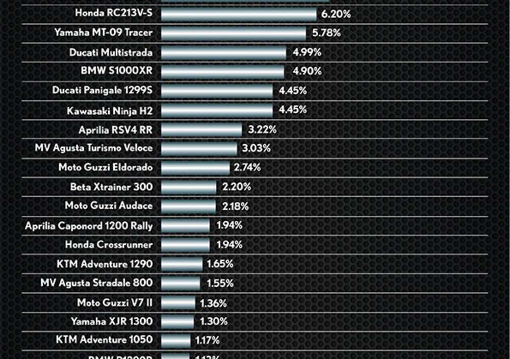Le prime dieci moto in classifica (che va osservato sono cinque super sportive, quattro fra crossover ed enduro e una classica) hanno raccolto il 64% dei consensi totali.