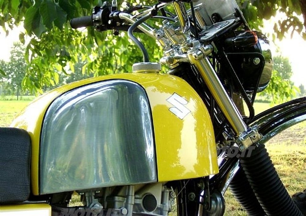 Su tutti spicca la scritta del serbatoio, un richiamo diretto, viscerale alla “S” delle Suzuki da cross degli anni ’70.