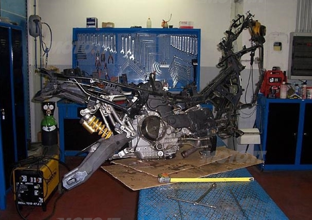 Il serbatoio è realizzato artigianalmente in alluminio e ha una capienza di soli 5,5 litri, di produzione Fuorigirimoto sono gli scarichi e le verniciature finali.