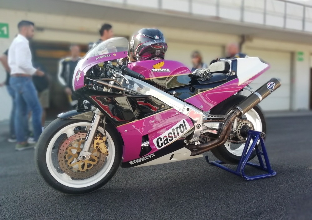 Uscendo dai box dopo l'avviamento a spinta, trovo una moto tutt'altro che rabbiosa, omogenea, dalla maneggevolezza infinita che combinata col notevole grip dell'asfalto può dare grandissime soddisfazioni. Mi tengo prudente, perché stendere un pezzo di storia (sopratutto quando il proprietario ha riposto grande fiducia affidandotela), anche no. Alla prima staccata più “interessante”, però non trovo confidenza con il doppio disco e mi prende male, ma non malissimo: grazie al ritmo blando inserisco senza problemi la RC30 nella esse destra-sinistra, ma questo episodio mi mette in guardia e da lì in poi penso soltanto a godermi il motore dall'urlo ruvido e dalla spinta regolare fino ai 13.000: oltre non ho azzardato, nonostante la difficoltà a trattenermi quando mi passavano pure in rettilineo, e a capire che adesso Pergusa è a tutti gli effetti un circuito che può tranquillamente dire la sua in un contesto internazionale.