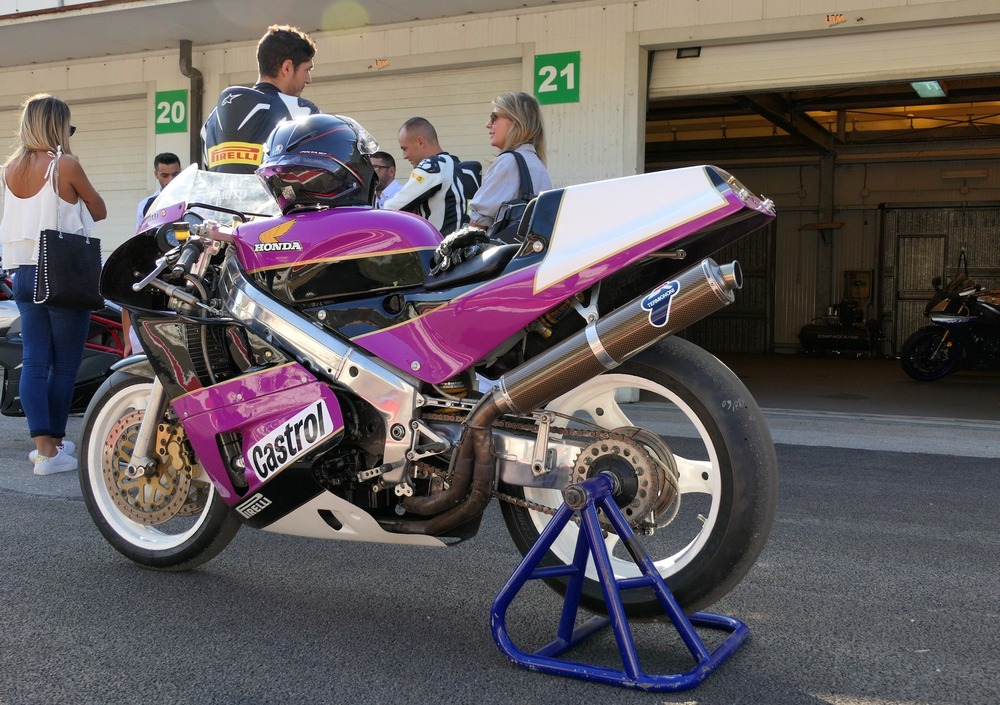 Salire su quella motocicletta viola e nera, anche solo da fermo, è un salto nell'emozione più intensa per qualsiasi appassionato. Non tanto per la potenza – in questo caso non impressionante - o le doti dinamiche, quanto per il concerto di sensazioni, di retropensieri, di domande cui si troverà una risposta: come va una vera superbike? Mi butterà a terra? Il motore avrà pietà di me? Salvo Pennisi mi avverte che l'erogazione sotto i 9.000 è un po' sporca, probabilmente per gli anni di fermo, e salgo sulla RC30 che è già andato via, probabilmente perché va bene la fiducia in me e in Moto.it, ma forse non voleva assistere. Tranquillo Salvo, a parte una piccola sfollata l'ho trattata bene: pure troppo.