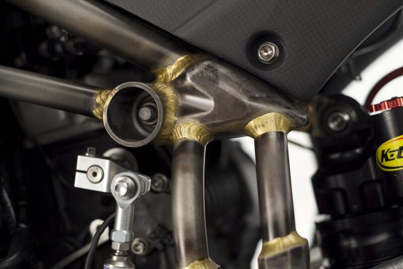 Per il telaio è stata scelta una struttura tubolare in acciaio al cromo molibdeno con diametri e spessori differenziati. In questo caso la particolarità sta nell'unione dei tubi ottenuta per saldobrasatura. Una scelta, dicono alla Spirit, motivata dalla possibilità di determinare meglio la flessione strutturale, e che permette di cambiare più facilmente le parti danneggiate da una eventuale caduta. Sono previste regolazioni per la geometria di sterzo, mentre il forcellone bibraccio è in lamiera di alluminio scatolata.
