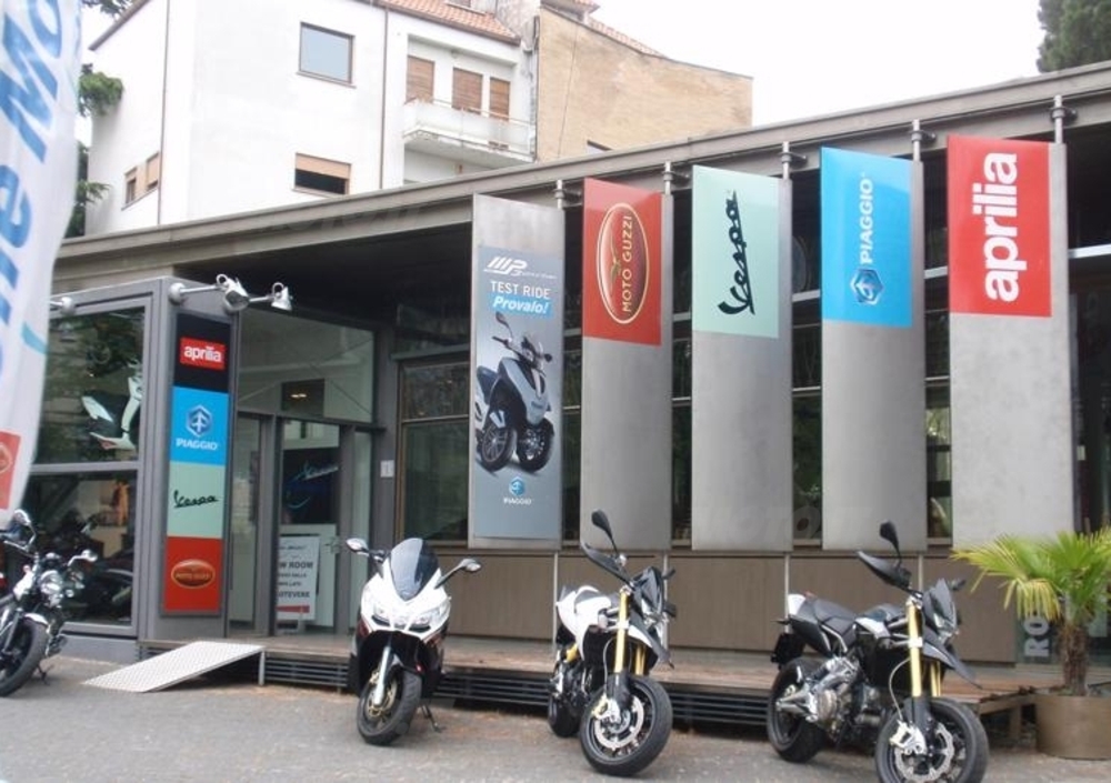 Siamo a Roma, quartiere Prati, cuore di quella capitale elegante di architetture sabaude, oggi sede affollata di studi professionali, sede di lavoro elitaria per professionisti in giacca e cravatta, quartiere che di sera cambia volto e si illumina delle mille luci dei locali più alla moda della movida di classe capitolina. Qui ha sede “Che Moto!”, concessionaria ufficiale per tutti i marchi del Gruppo Piaggio, oramai indiscusso punto di riferimento per il pubblico capitolino per quanto riguarda la vendita e l’assistenza di moto e scooter. Una sede di rappresentanza, affacciata sull’argine del Tevere, davanti cui sciama ogni giorno il traffico convulso di Roma. Difficile non notare le moto e gli scooter esibiti sul piazzale, impossibile scacciare dalla mente - mentre si è in auto, prigionieri del gioco dei semafori e delle altre vetture incolonnate - che su due ruote sarebbe facile sfuggire alla terribile trappola. E come un bel miraggio, Che Moto! indica la soluzione ai problemi di mobilità individuale: un bello scooter, o una moto, ed il gioco è fatto!