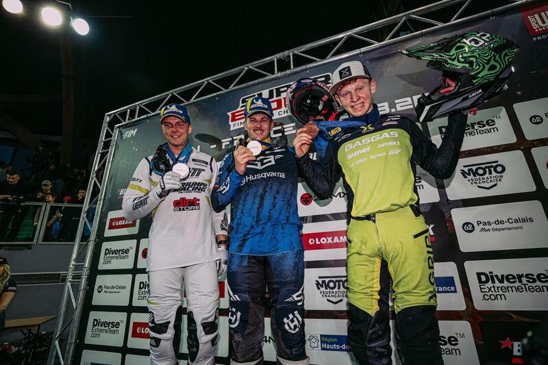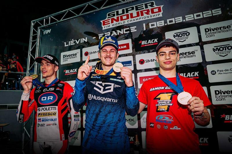 Liévin, Francia, 9 Marzo. Settima e ultima tappa del Campionato Mondiale FIM SuperEnduro. L’impianto di Liévin, costruito su terreno argilloso, è particolarmente tecnico e difficile, con buche e solchi che hanno reso le gare ancora più complicate del solito. Gli errori sono facili e frequenti, ma i piloti hanno offerto al pubblico dell'Arena Stade Couvert di Liévin, come sempre full, uno spettacolo grandioso. Una serata emozionante a conclusione di una stagione breve ma intensa. Billy Bolt, Husqvarna, già campione della classe Prestige dopo la penultima gara di casa a Newcastle, UK, ha chiuso la stagione a suo modo, cioè perfettamente. Il pilota britannico ha conquistato la SuperPole e vinto le tre le gare della serata, dimostrando ancora una volta una superiorità netta e mettendo in fila il quinto Titolo di Campione del Mondo consecutivo. Jonny Walker, neo acquisto Triumph, si è dovuto “accontentare” del secondo posto, Ashton Brightmore, terzo, ha messo dietro di poco suo fratello Mitchell. La classifica finale del Mondiale è speculare a quella della serata francese: Billy Bolt, Jonny Walker e Ashton Brightmore.