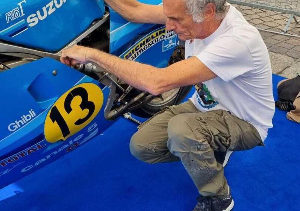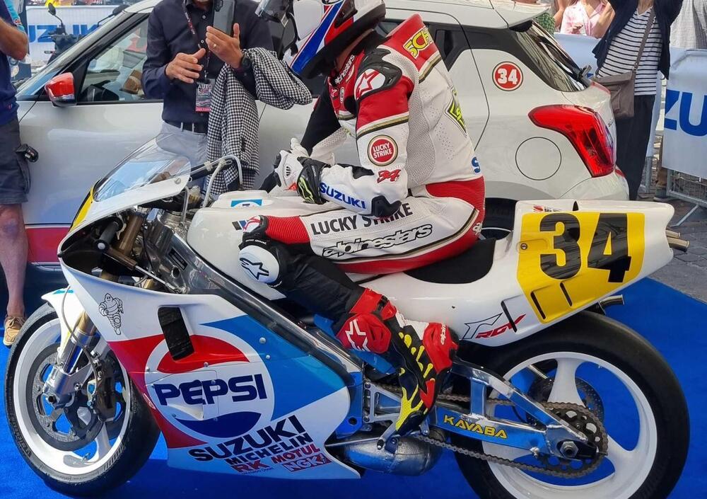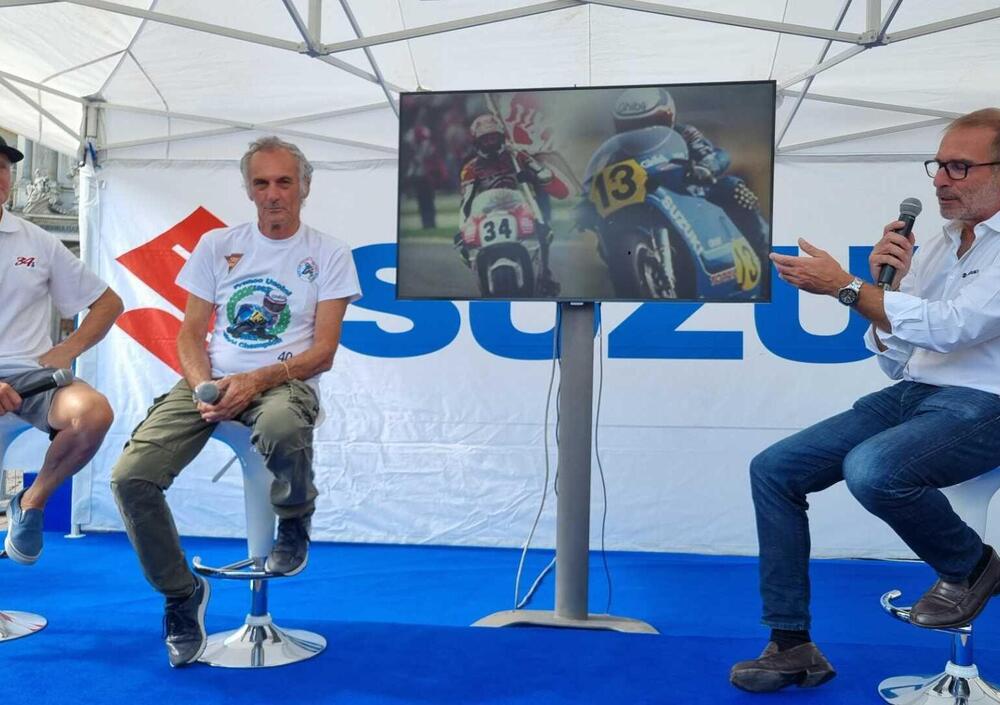 Presenti nello stand due moto che hanno fatto la storia del marchio, la RG 500 di Franco Uncini, originale in tutta la sua bellezza, la moto campione del mondo ci ha fatto sentire la sua spettacolare colonna sonora, e la RGV 500 del 1989 di Kevin in livrea Pepsi (quella del 1993 che ha vinto il titolo aveva la colorazione Lucky Strike). Anche questa ha fatto sentire la sua voce.