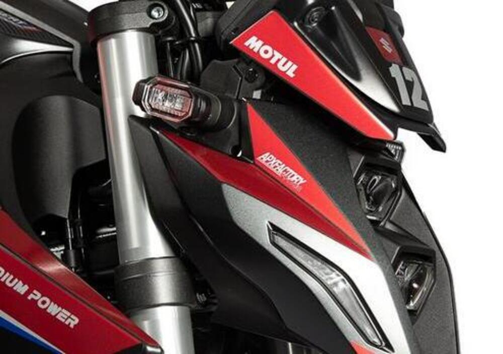 In entrambi i casi gli indicatori di direzione a LED (nel mercato francese, a differenza dal nostro, gli indicatori di direzione della streetfghter giapponese sono alogeni) e le spese di installazione sono escluse dal costo dell kit. Immutata comunque la base tecnica con il motore bicilindrico in linea da 776 cc e fasatura degli scoppi a 270° che esprime una potenza massima di 83 cavalli 8.500 giri e un picco di coppia pari a 78 Nm a 6.800 giri, accoppiato al telaio in acciaio con forcellone in alluminio. Trovate la nostra prova nell'articolo nel box qui in basso.