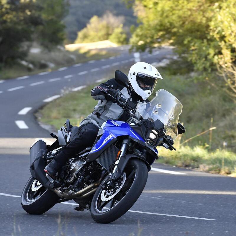 Alle spalle di un cupolino in cui trova posto una fanaleria a LED compatta c’è un ponte di comando dominato da una coppia di semi-manubri in alluminio forgiato. I collaudatori Suzuki hanno definito la loro posizione con estrema cura, dando vita a una posizione sportiva ma non estrema, che rende la guida coinvolgente limitando l’affaticamento anche nel turismo a lungo raggio.