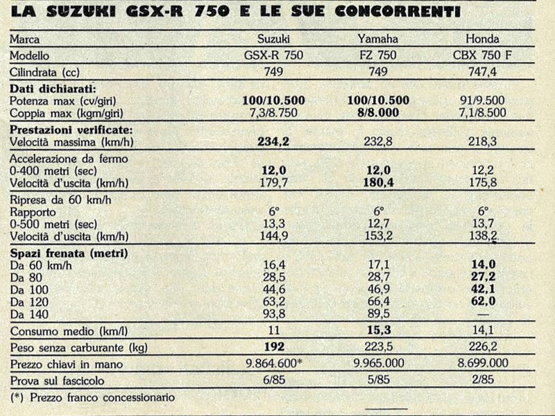 Abbiamo già annunciato per questa moto prestazioni eccezionali. La nuova Suzuki oggi certamente divide con la Yamaha FZ il trono della categoria settemezzo, in attesa di sfida da parte della Honda (che pare stia per presentare addirittura due 750 sportivissima siglate «R», una con motore V4 e una con un “4 in linea”) e della Kawasaki (di cui non viene importato in Italia la GPZ 750R, troppo vicina alla gemella 900 per avere successo). Con 12 secondi netti sui 400 metri da fermo (rilevati con pilota di 75 chili e l'apparecchiatura Peiseler a bordo) e più di 234 chilometri orari di velocità massima effettiva, la GSX-R, almeno per un po’, è dunque la nuova regina della sua categoria, della quale tiene indisturbata lo scettro per quanto riguarda il peso, dove vince il confronto anche con la stessa Yamaha RD 500 LC.