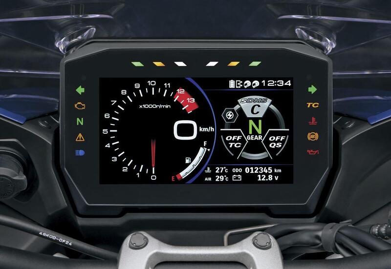 Le ricche funzioni comprendono il livello carburante, il consumo medio e istantaneo, le indicazioni per il quick-shift, per i riding mode e per il controllo di trazione. E' dotata di cruise control e di connettività per lo smartphone: grazie all'applicazione mySPIN di Suzuki, scaricabile gratuitamente, consente le interazioni con le funzioni dello smartphone (telefonate, musica e quant'altro) compresa la funzione di navigatore con mappe specifiche della app.