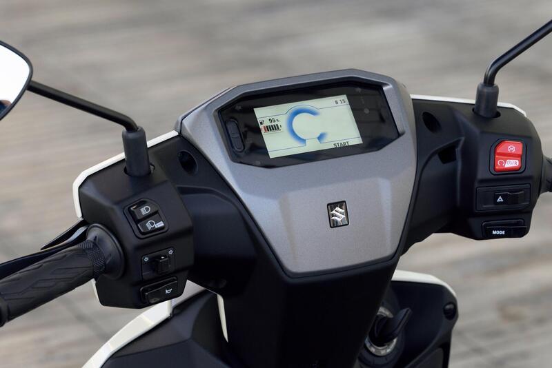 Suzuki e-Address dispone di un sistema di frenata rigenerativa che converte l'energia cinetica durante la decelerazione e di una modalità di retromarcia utile negli spazi di parcheggio stretti.