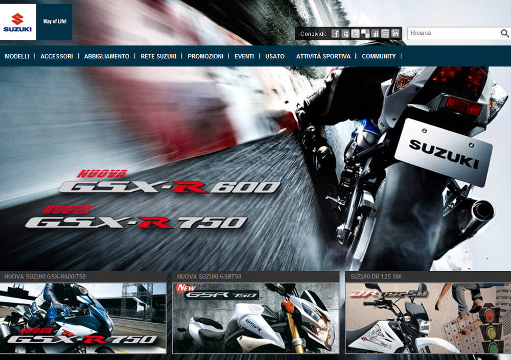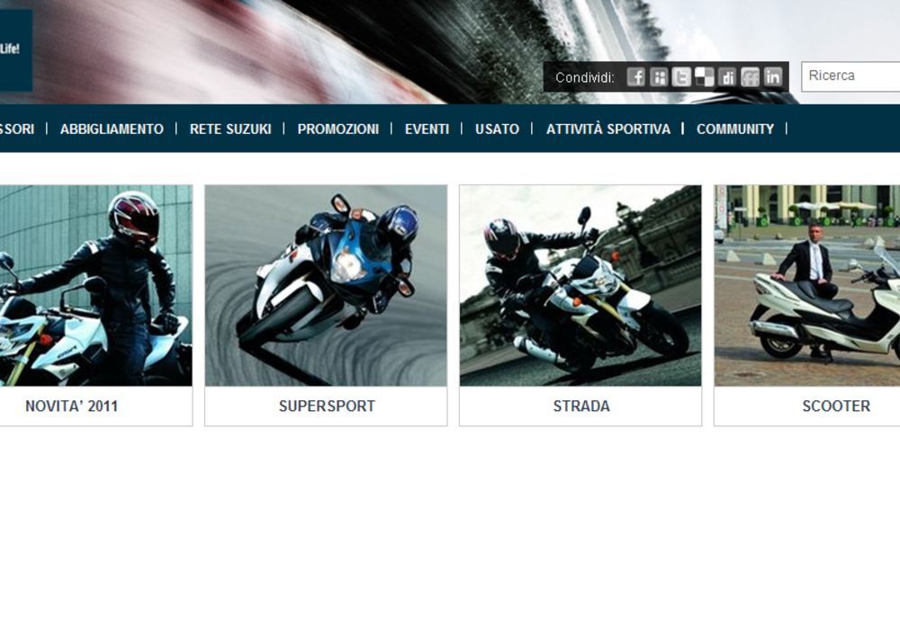 Il sito Suzuki, www.suzuki.it, si rinnova nella grafica e nei contenuti tecnologici, presentando una struttura semplice e intuitiva, organizzata in tre minisiti tematici dedicati alla moto, all'auto e ai fuoribordo.