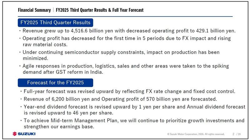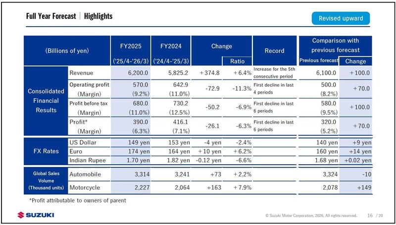 Nonostante le pressioni sui margini del terzo trimestre, Suzuki ha deciso di rivedere al rialzo le previsioni per l'esercizio 2026. I ricavi attesi salgono a 6.200 miliardi di yen (33,5 miliardi di euro), con un incremento di 100 miliardi rispetto alle stime precedenti, mentre l'utile operativo è previsto in crescita di 70 miliardi, fino a 570 miliardi di yen (3,1 miliardi di euro).