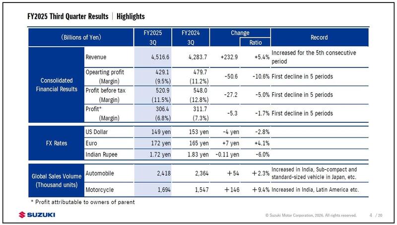 Il terzo trimestre dell'esercizio 2025 (ottobre-dicembre) di Suzuki si chiude con un quadro composito che riflette le sfide attuali del settore automotive e motociclistico globale. La Casa di Hamamatsu ha registrato ricavi per 4.516,6 miliardi di yen (24,4 miliardi di euro), in crescita di 232,9 miliardi rispetto allo stesso periodo dell'anno precedente, ma l'utile operativo ha subito una contrazione di 50,6 miliardi di yen, fermandosi a 429,1 miliardi (2,3 miliardi di euro).