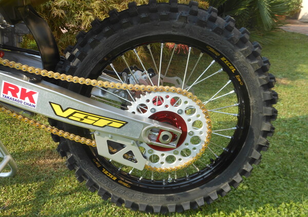 Le ruote ricevono mozzi Kite Elite di colore rosso, ricavati dal pieno e cerchi Excel neri. I dischi freno sono forniti dalla Braking (anteriore da 270 mm batfly semiflottante, posteriore da 240 mm). La catena è RK MXZ4 oro. Il silenziatore originale lascia il posto a quello in titanio Akrapovic. I pararadiatori sono gialli e abbondano i particolari in ergal.