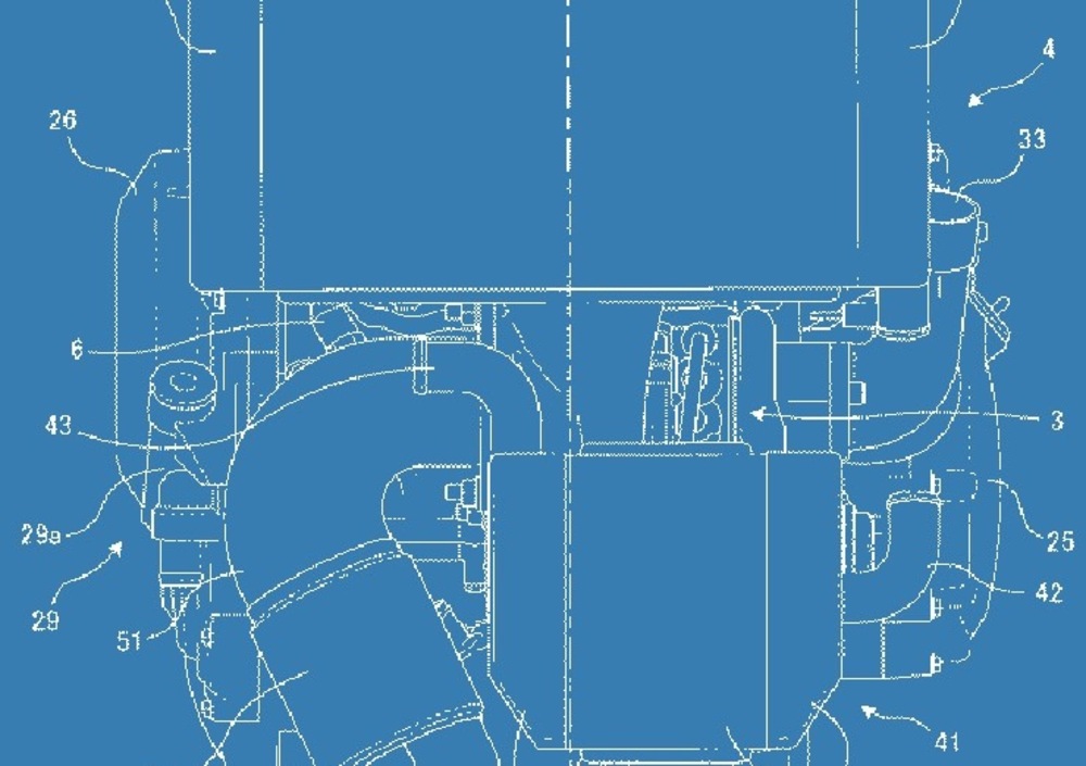 Il brevetto è relativo al posizionamento delle componenti - del packaging, come si usa dire, con un catalizzatore ora posizionato molto in alto nel percorso dello scarico, e differenti posizionamenti e dimensionamenti per i radiatori, come si evince dalla vista frontale. I due radiatori lasciano spazio fra sé per permettere al flusso d'aria di raffreddare direttamente il turbocompressore (identificato con il numero 3), soluzione che potrebbe trovare controparte nella scelta di un telaio misto traliccio/piastre, visibile nel primo brevetto, che dovrebbe permettere una miglior circolazione dell'aria.