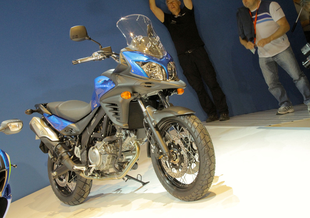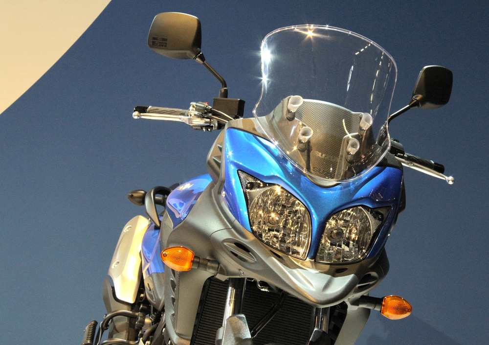 Ad un anno di distanza dalla V-Strom 1000, Suzuki si rinnova proponendo qui al Salone Intermot di Colonia, una nuova versione della sorella minore 650 che segue lo stile estetico della maxi ma con una maggior connotazione avventuroso/turistica. E’ evidente infatti l’influenza della sorella maggiore nel “becco” sotto il doppio faro che integra le prese d’aria dell’aspirazione, sovrastate però qui da un gruppo ottico (immutato) disposto orizzontalmente invece che verticalmente come sulla 1000.