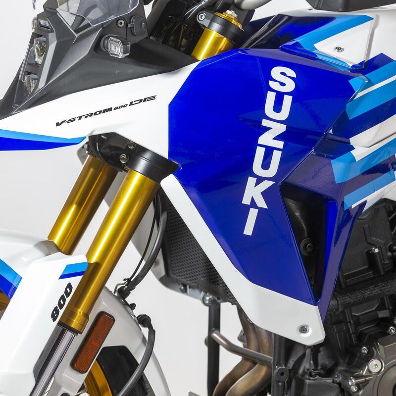 La V-Strom 800DE è dotata di un motore bicilindrico parallelo da 776 cc con distribuzione bialbero DOHC a quattro valvole per cilindro con una potenza massima di 83,4 cavalli; l'elettronica comprende anche la modalità specifica G (Gravel) utilissima in fuoristrada per consentire diversi livelli di slittamento della ruota posteriore in accelerazione, mentre l'ABS ha una modalità dedicata al fuoristrada e può essere disinserito sulla ruota posteriore per rendere efficace e sicura la marcia sui terreni a scarsa aderenza come le strade bianche.