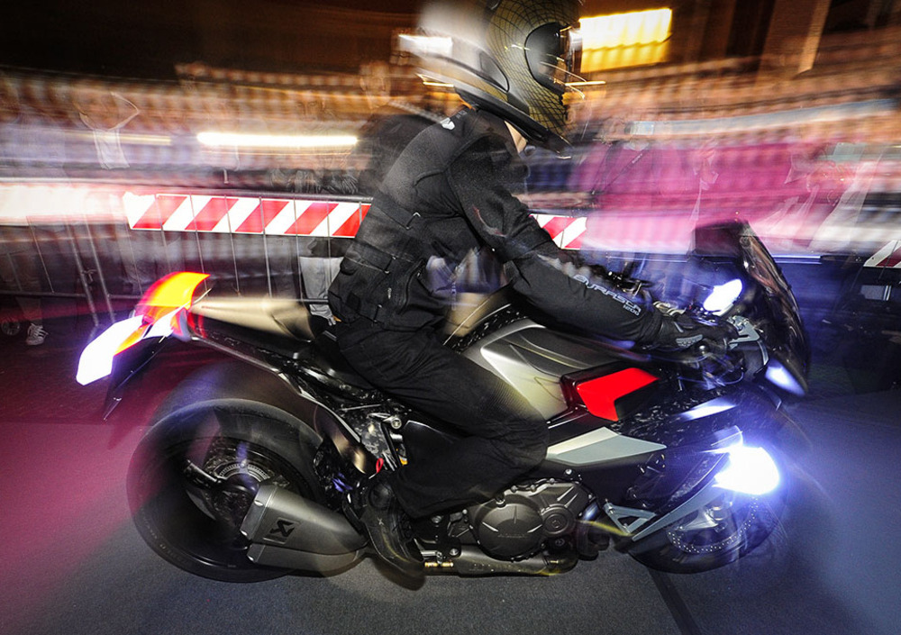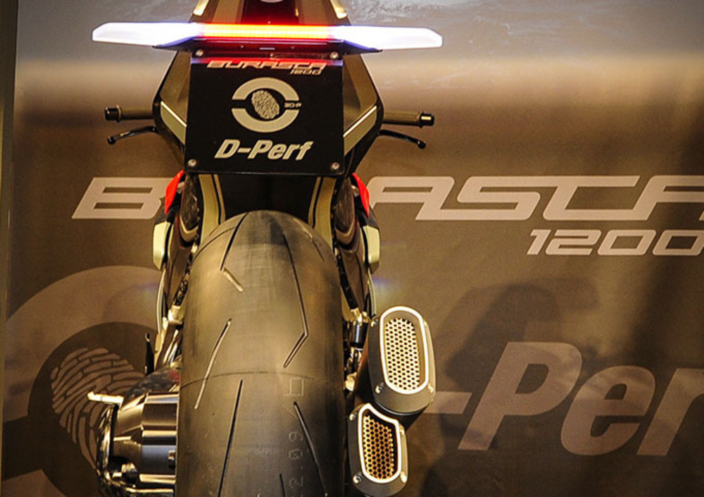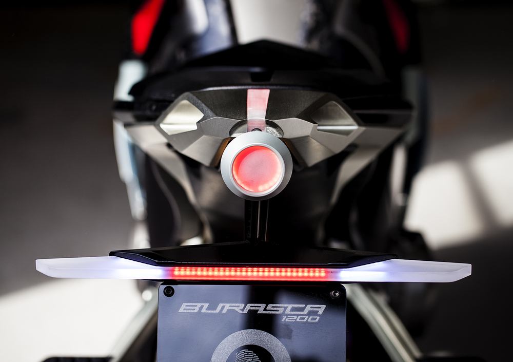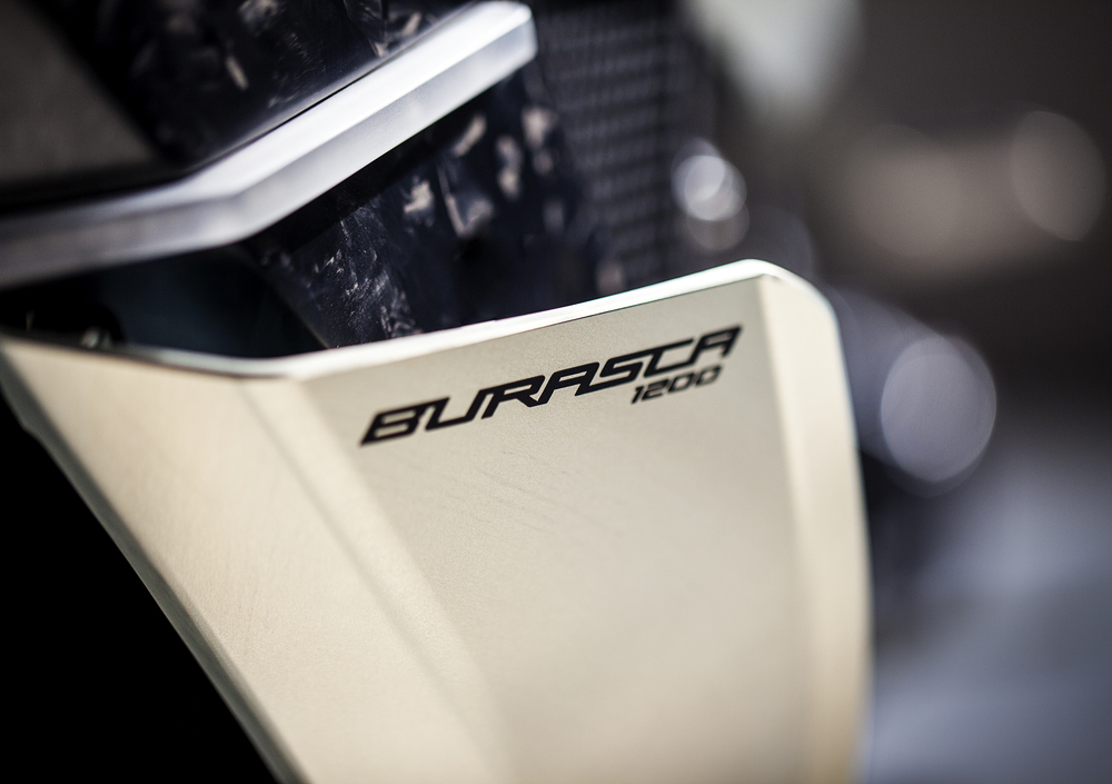 La base di partenza è un VFR 1200 Honda radicalmente modificata in ogni sua parte. La posizione in sella, avanzata rispetto all’originale, permette nel caso di una guida più aggressiva/sportiva di caricare l’anteriore equipaggiato con forcella Öhlins NIX 30. Pratica la regolazione dell’ammortizzatore posteriore Öhlins TTX 36 GP vicino al cannotto di sterzo. Burasca pesa 30 Kg in meno del VFR originale a vantaggio della maneggevolezza. Più leggeri i cerchi in Ergal realizzati dal pieno da Fast Mec a garanzia di maggiore rapidità nei cambi di direzione. Burasca è equipaggiata dal classico 4 cilindri a V Honda nella versione F. La ghiera tonda del faro anteriore e del piccolo faro posteriore garantiscono un aspetto classico ma estremamente pulito e moderno. Realizzati da CPC gli splendidi componenti costruiti grazie alle più avanzate tecnologie per il trattamento della fibra di Carbonio e dalla sapienza artigianale di operatori specializzati nella laminazione, importante risorsa dell’azienda modenese. CPC ha prodotto in Carbonio “camouflage look” le plance laterali che fungono da carena, la cover serbatoio/sella, il carter cardano e il parafango posteriore che si accoppia millimetricamente ai componenti in Ergal anodizzato. In linea la scelta stilistica per l’impianto di scarico realizzato da Akrapoviĉ, un ulteriore pezzo d’arte moderna costruito appositamente per BURASCA dai tecnici dell’azienda slovena. Il disegno dei terminali realizzato da Drudi Performance si ispira ai vecchi “tromboni” rivisti nelle proporzioni e nella sezione, in questo caso, ovale. Collettori in Titanio, terminali in Titanio microfuso, compensatore in Titanio microfuso con la ricchezza del logotipo Honda in bassorilievo.