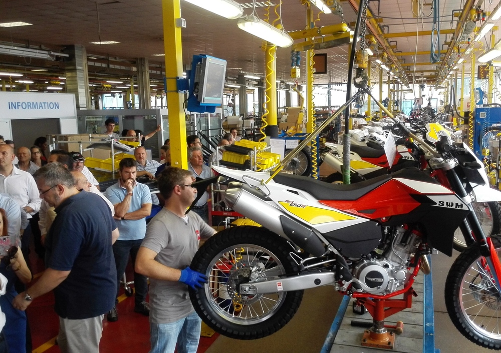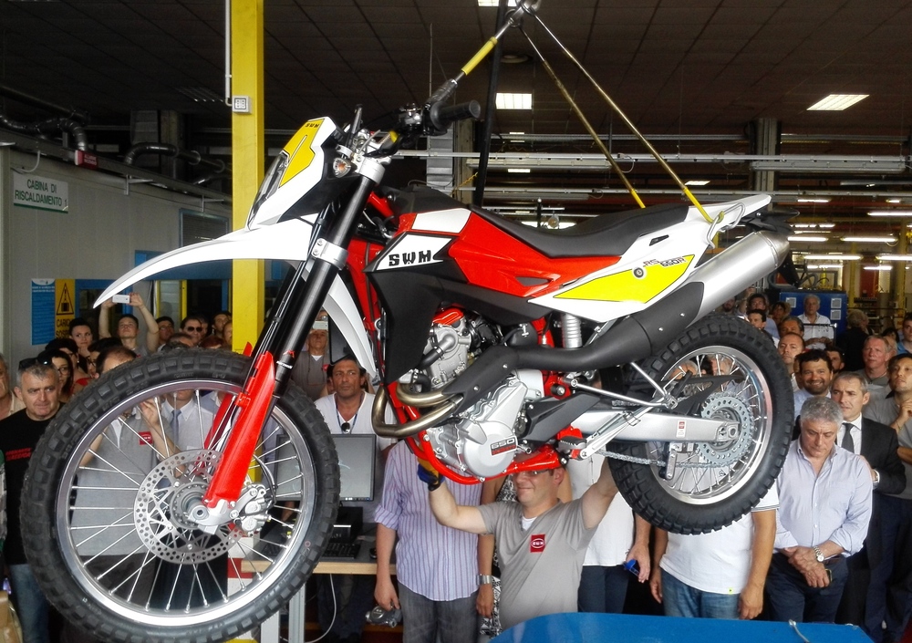 All'inaugurazione della produzione erano presenti le maestranze, una sessantina al momento, alcune delle quali avevano già lavorato in questo stabilimento quando si qui producevano le Husqvarna, l'ingegner Ampelio Macchi – progettista con un lungo trascorso nel settore e CEO della SWM –, il presidente della Regione Lombardia Roberto Maroni e il direttore generale Mr. Zhong in rappresentanza della Shineray Group. Ovvero l'importante azienda cinese - guidata da Daxing Gong - che ha finanziato l'operazione e che è impegnata nella fabbricazione di moto stradali, da fuoristrada e ATV che sono esportati in 86 Paesi. Fra gli intervenuti all'inaugurazione produttiva anche gli ex piloti Gualtiero Brissoni, Pierluigi Rottigni, Pietro Gagni e Andrea Marinoni che con le SWM del passato hanno corso e vinto nella Regolarità, Sei Giorni compresa.